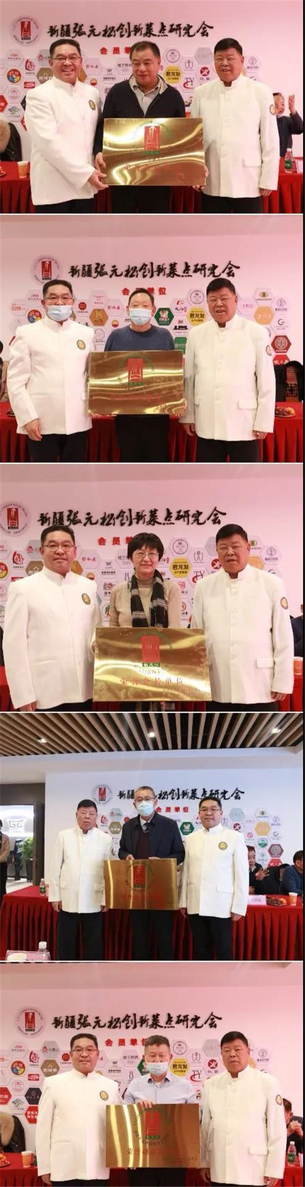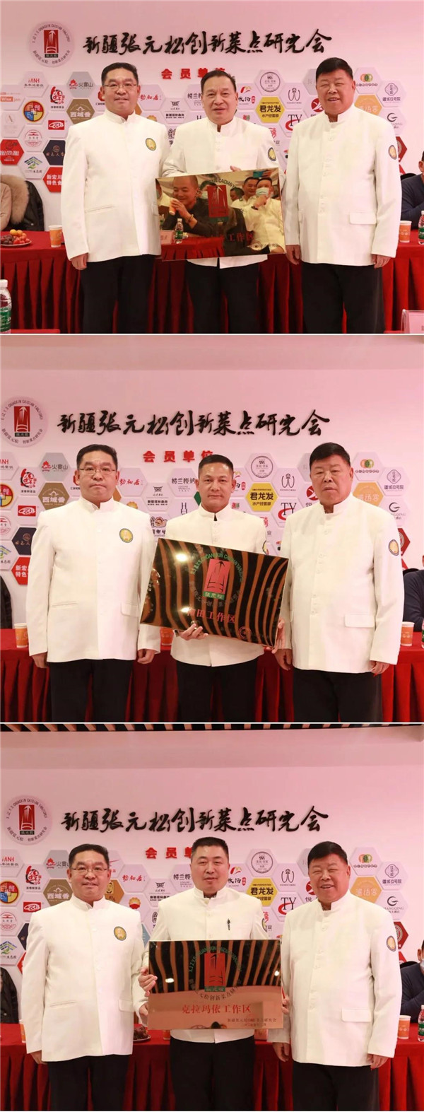 接着由张元松大师、白玉清会长对新疆烹饪协会、乌鲁木齐饮食行业服务协会、新疆丝路特色餐饮研发中心等全疆12个荣誉会长单位、9个荣誉副会长单位颁发了牌匾,同时也为18个工作区和元老级、精英级、资深级、新秀级专业委员会主任颁发了牌匾和任命证书。