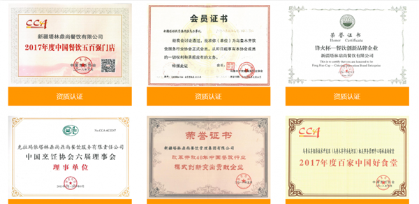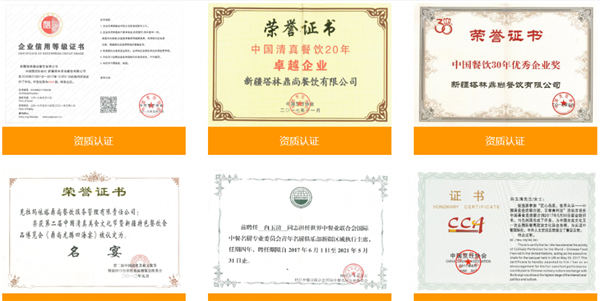 “2017-2020年度新疆特色餐饮品牌企业”、获得明星产品荣誉有:“第二届中国清真美食文化节《鼎尚龙腾四海宴》认定为名宴”、“新疆金牌小吃(葱花饼)”、“新疆名小吃(鼎尚牛肉面)”、“新疆名小吃( 花园长排)”等荣誉牌匾 。
