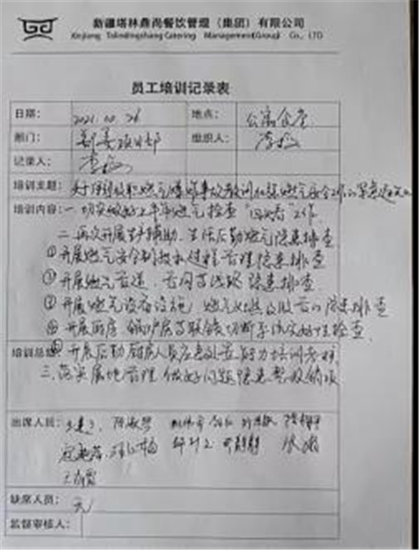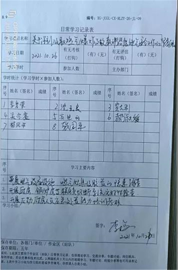 其中,九游平台(吐哈分公司)于2021年10月26日对鄯善管道公寓食堂、末站食堂全体九游平台进行了文件的贯彻学习,当天对各个管线及联动装置进行了测试工作,锅炉房及外部管线的外部阀门、压力表及接口处、流量计接口处、电磁阀、伸缩节连接处、放空阀连接处、调节装置等各部位进行了检测工作。