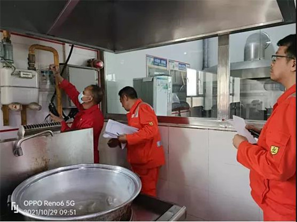 于2021年10月29日,西部管道公司安全科、主管后勤人员对管道公寓食堂、末站食堂各个管线进行了测试及全方位复检工作,主要采取了边检查、边整改的方法,现场查、改结合,现场无法解决的问题,提出了整改方案,要求一定要落实到位,并由相关部门监督执行。