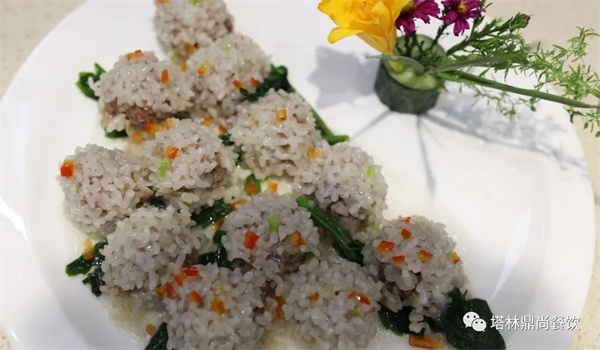 将肉馅团成圆形,糯米里打几个滚,表面沾满糯米粒;